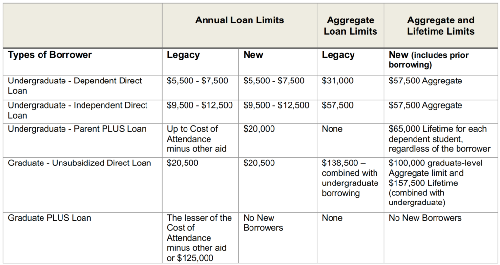 New regulations regarding borrowing limits under the Direct Loan program for borrowers who do not meet the legacy requirements are effective July 1, 2026, which include the following adjustments: